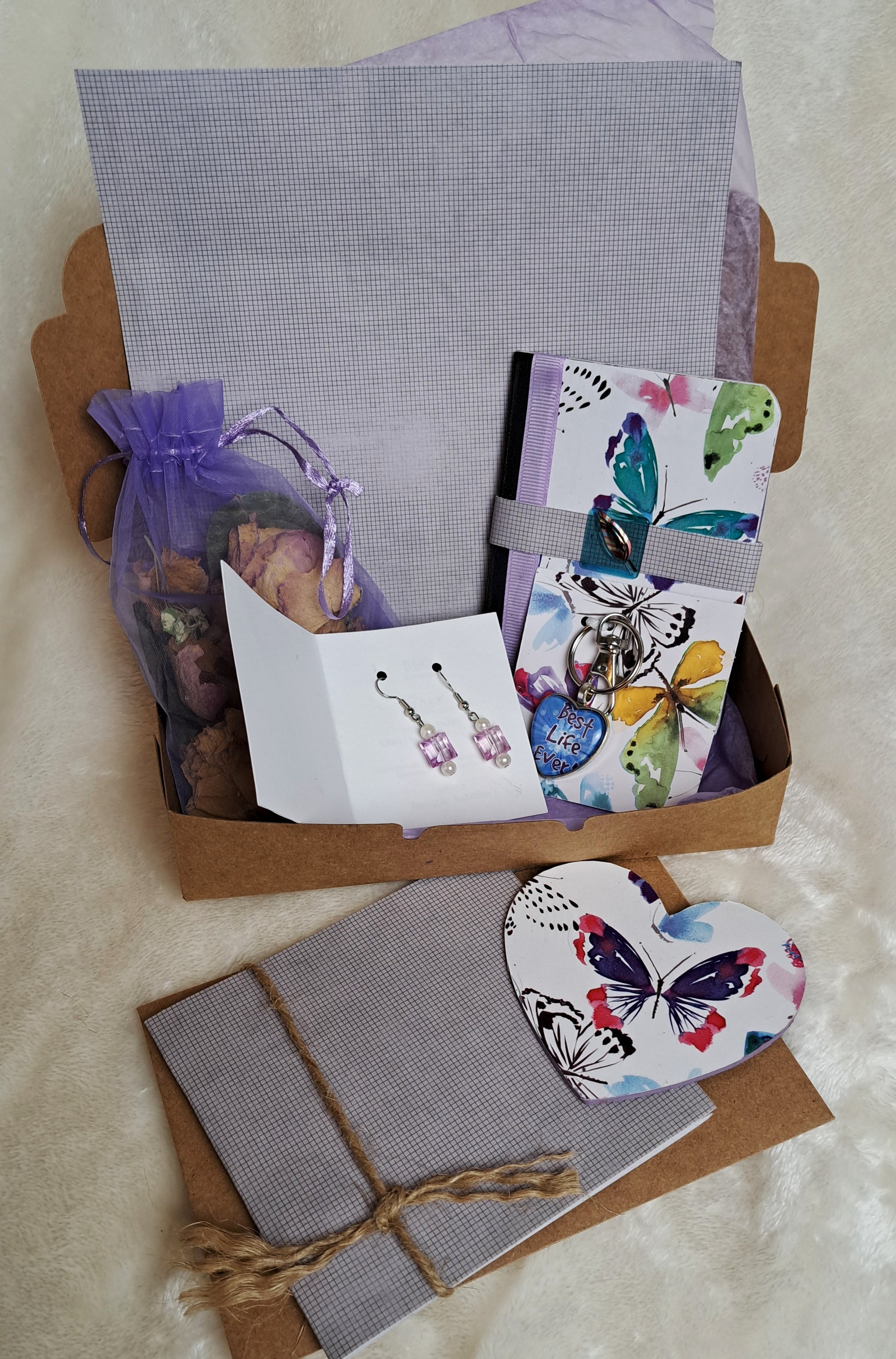 Gift Box for the Ladies. Potpourri, Wooden Heart Magnet, Modge Podge Notebook 3x3, Best Life Ever Key ring, Handmade Earrings, Greeting Card
